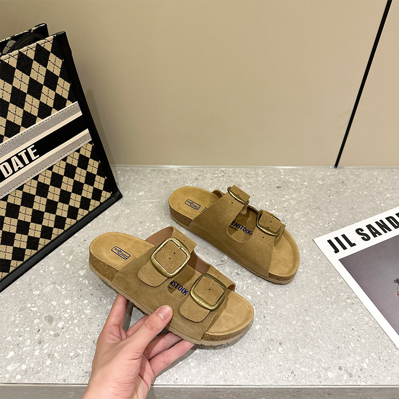 反絨皮の本革のサンダルの女性は夏に2025の新型の厚い底のベーケンのサンダルの女性を着てボーケンの靴を漕いでいます。