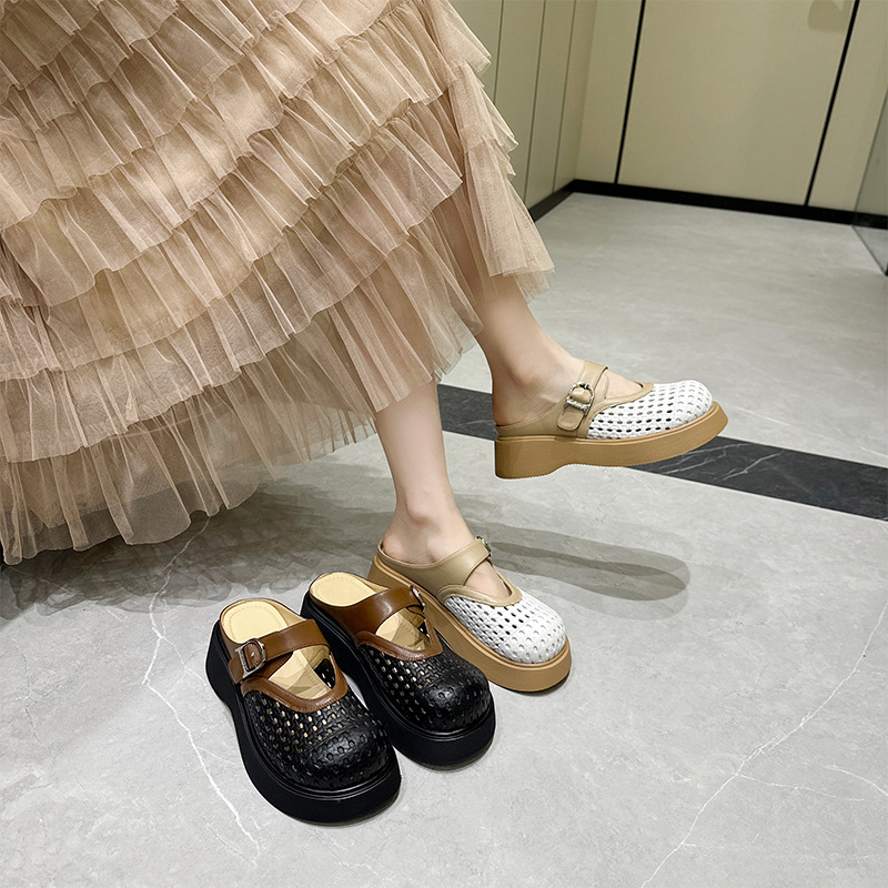 トップ層牛革透かし彫りネット圧印カジュアルシューズ女性2025春夏メアリージェーン女性靴厚い底ベーケンサンダル女性