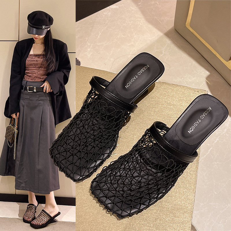 包頭半スリッパの女性は2025年夏の新型ネット面の透かし彫りサンダルを履いています。
