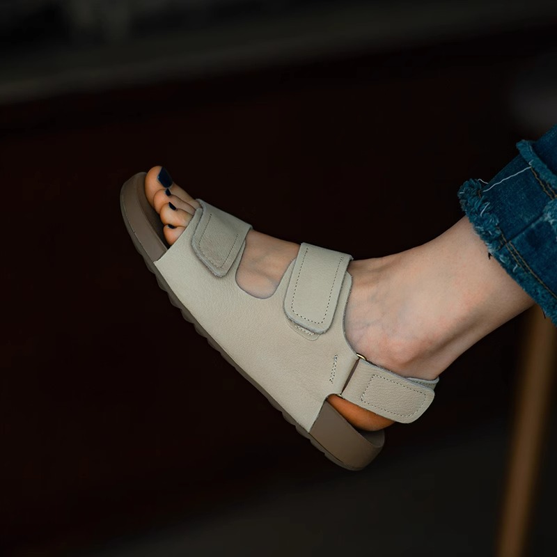 Sen Shi ウェッジソール ウェッジソール スリッパ レディース 夏用 ソフトレザー ミッドヒール オープントゥ ベルクロ カジュアルサンダル