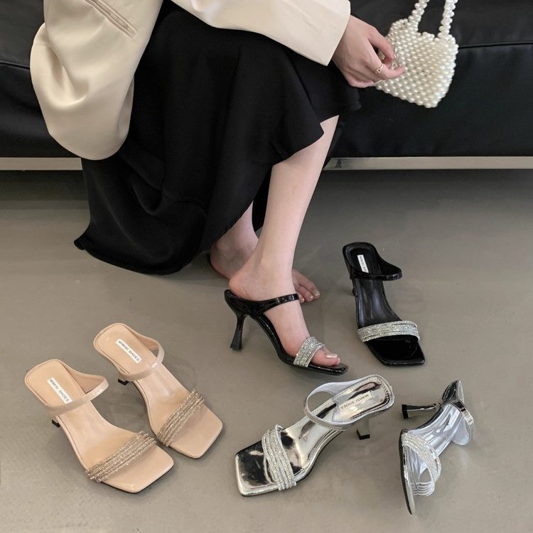 ラインストーンストラップハイヒールサンダル女性のための 2025 夏の新しいスタイルスクエアトゥオープントゥフレンチスタイルファッショナブルなスティレットハイヒール