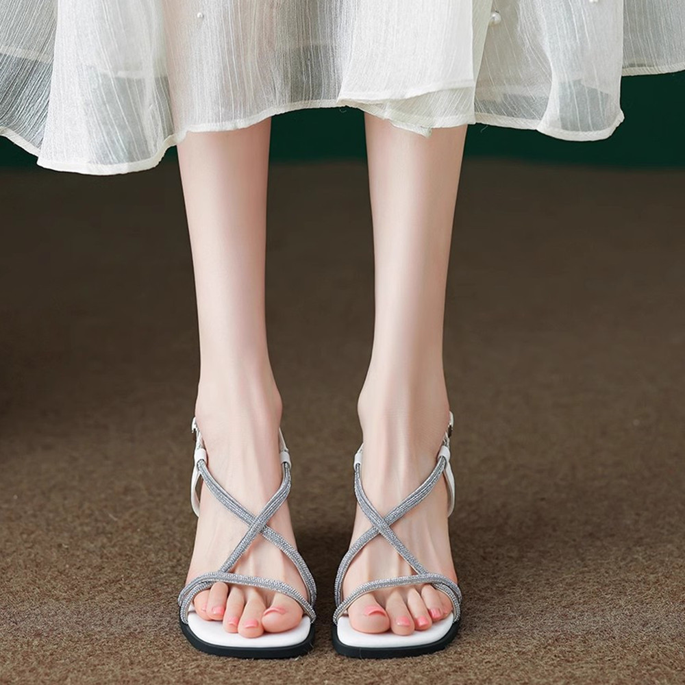 女性用の非常に柔らかいサンダル、夏のアウターウェア、絶妙な太いヒールのハイヒール、涼しいラインストーンのワンラインバックルの女性用靴、美しいフレンチスタイル