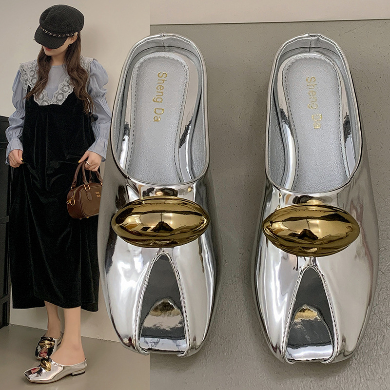 2025 新しいキャットウォークスタイルファッショナブルな光沢のあるメタルバックルフラットスリッパセクシーな魚の口オープントゥサンダル女性の靴卸売