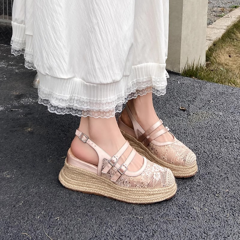 夏の包頭サンダル女性2025新型レースネット糸抜き通気厚い底スリッパ草編み漁師スカート
