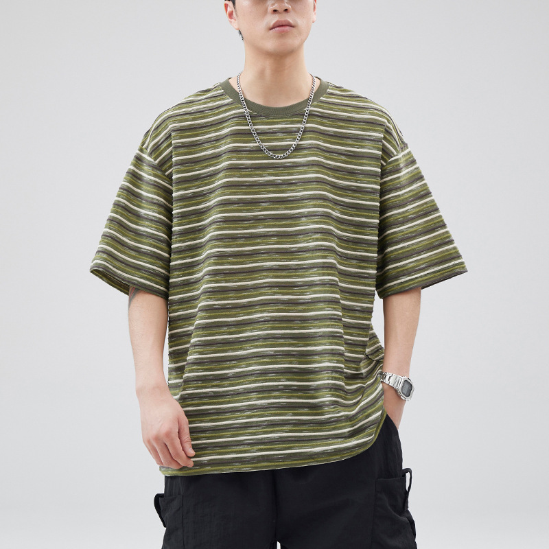 送料無料アメリカンレトロ半袖Tシャツメンズ夏ストライプトレンドルーズカジュアルトレンドブランドメンズ2025