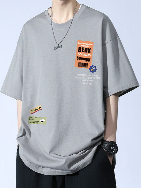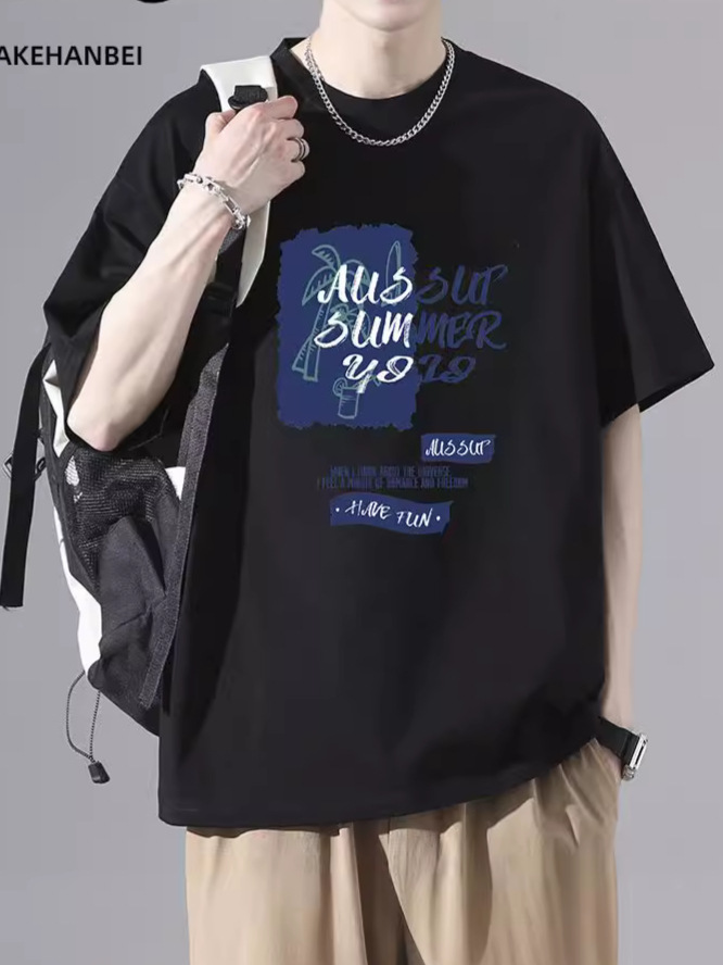 送料無料純綿ヘビーウェイト半袖メンズ Tシャツ夏のトレンディなブランドプリントルーズラウンドネック多用途香港スタイル Tシャツ 2025