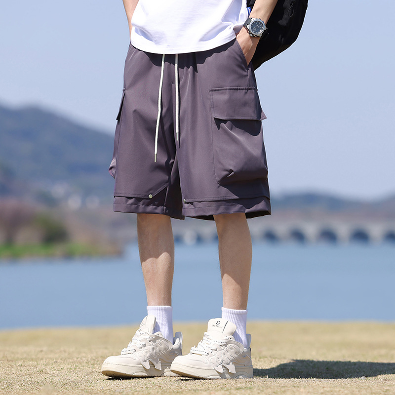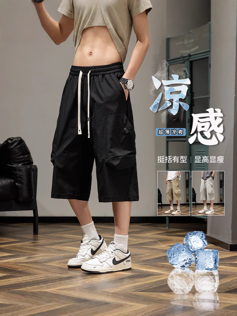 送料無料アイスシルククロップドパンツメンズサマーカーゴショーツ薄手カジュアルトレンドルーズストレートスポーツサンド2025