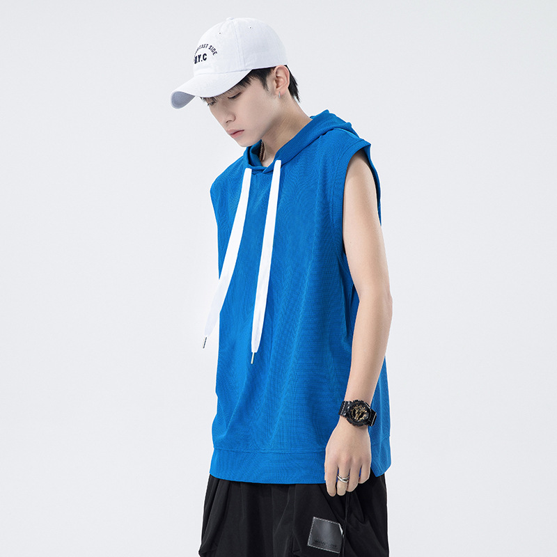 包郵便夏潮牌連帽袖なしtシャツ男性ワッフル純色男性シャツベストゆるい体2024