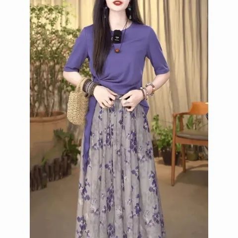 新中国式国風プリントvネックワンピース女性2025夏の新型ゆるい痩せたカジュアルな気質の長いスカート