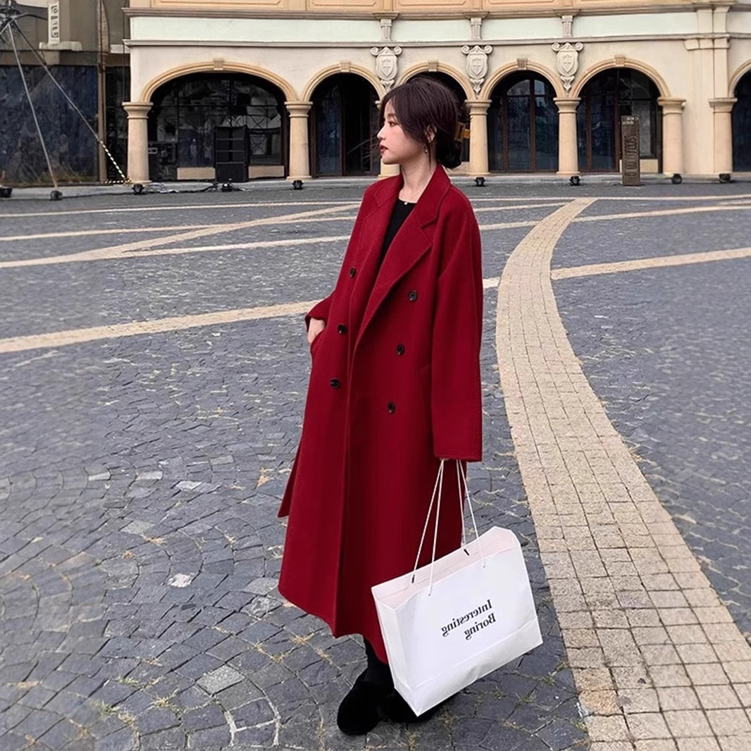 赤い中長の毛はコートの女性秋冬の韓国版chiの新型の高級感があります。