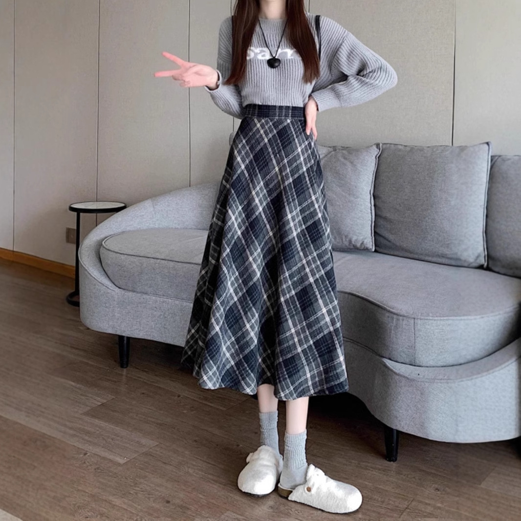 美ラードの高い腰の毛の半身のスカートの女性の冬の韓国版の新型の格子は傘のスカートの中の長いa字のスカートを合わせます。