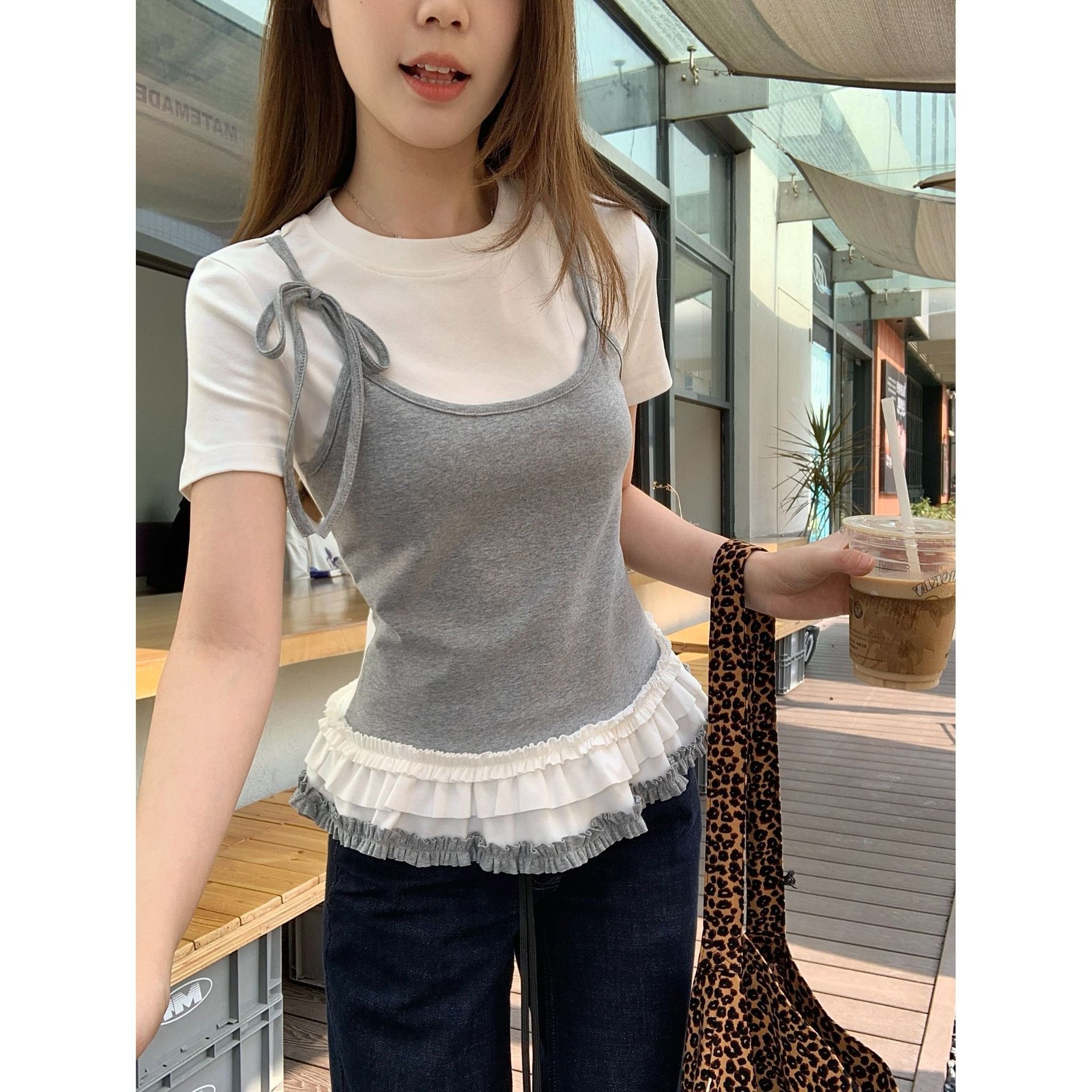 韓国風フェイクツーピースサスペンダーパッチワークカラーブロック半袖Tシャツ夏甘い年齢軽減耳付き小柄万能トップス