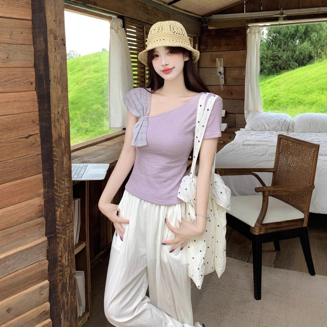 韓国の甘くて爽やかな斜め襟リボン半袖Tシャツレディース夏デザインニッチ気質スリムショートトップ