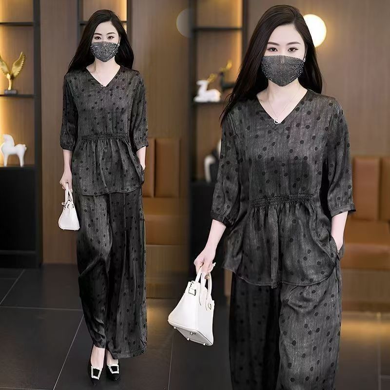 中高年気質大きいサイズ婦人服ママ服夏痩身ワイドレッグパンツ2点セットトレンド半袖トップスセット