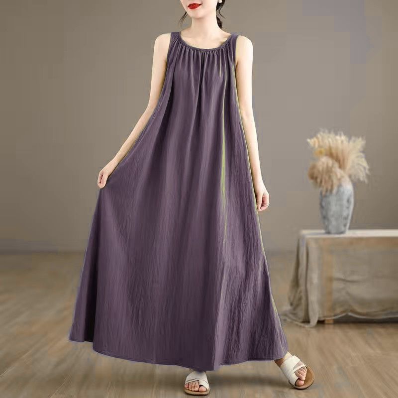 綿とリネンのドレス女性の夏の新しいルーズな新しい中国風のプリーツ怠惰なノースリーブハイセンスドレス女性用