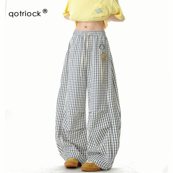 夏の男性と女性のためのレイジーチェック柄カジュアルシミターパンツ、トレンディなスターペンダントワイドレッグパンツ、ルーズカップルロングパンツ