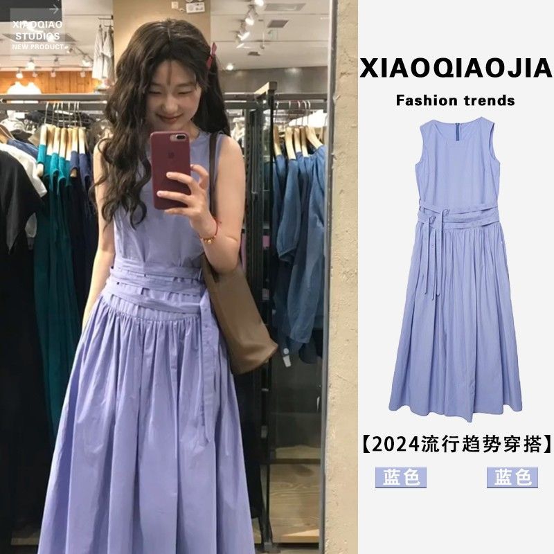 クロスボーダー新製品ノースリーブブルーベストドレス女性のデザイン 2025 夏フレンチシックなウエストタイドレス