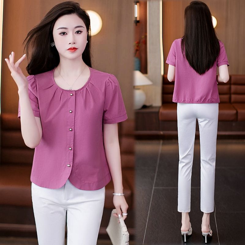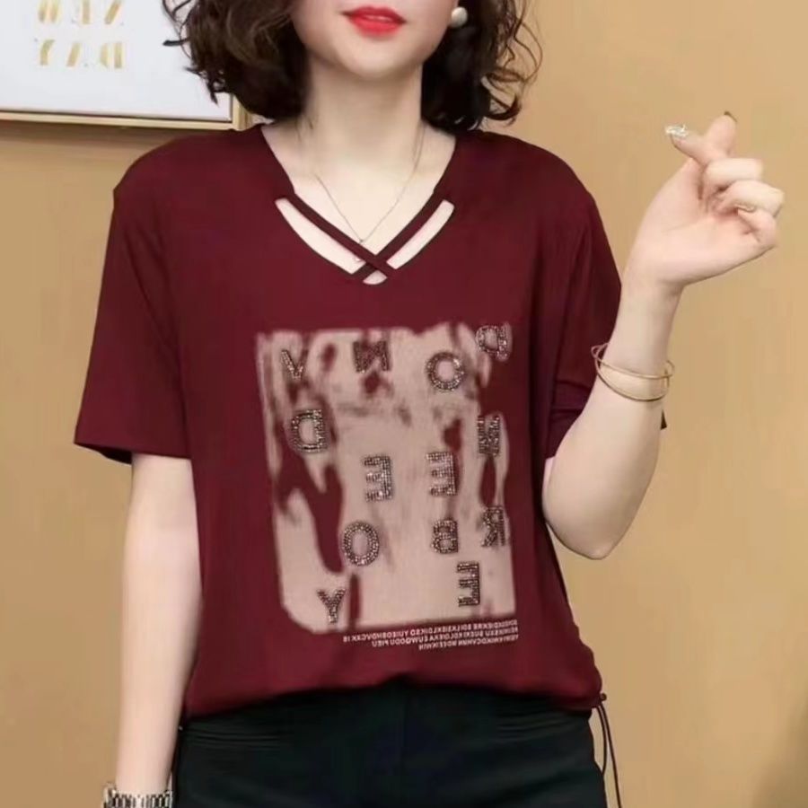 2025年新作ママの大きいサイズの夏服、ファッショナブルでスリムなシャツ、エレガントで年齢を軽減する半袖ボトムレディーストップス