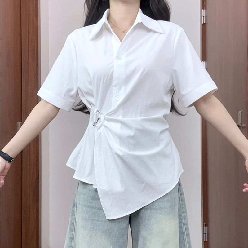 不規則なウエスト痩身ポロカラーシャツ 2025 夏韓国スタイル右肩半袖無地デザイン新作トップ