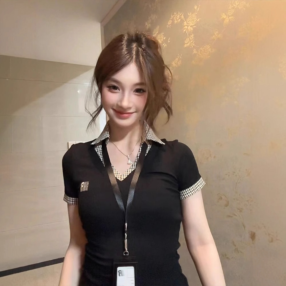 アメリカンホットガールラペルショルダー半袖シャツ女性のための新しい 2025 夏デザインスプライシングチェック柄 v ネック tシャツ