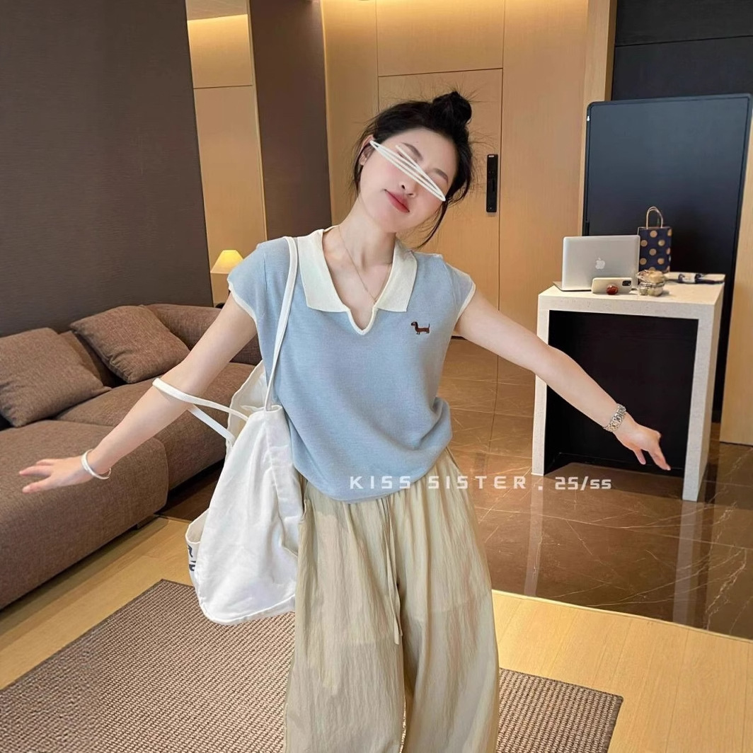 夏の新しい韓国スタイルのシンプルな子犬刺繍カラーブロックラペルトップ女性のためのルーズ年齢軽減半袖ニット Tシャツトレンディ