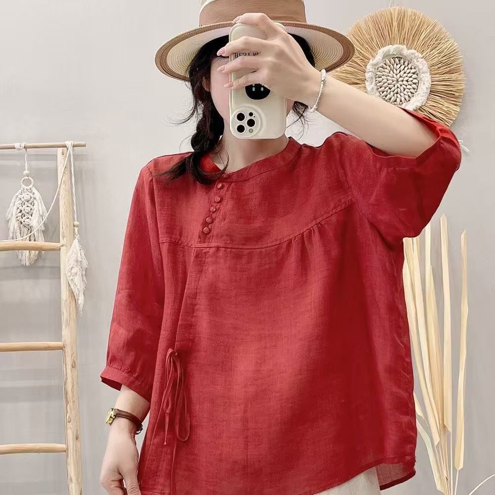 レトロな綿とリネンのファットMMプラスサイズのゆったりとした年齢を減らす女性の夏の文学的な新しい中国風のレースアップ半袖Tシャツトップス女性用
