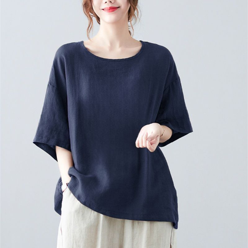 ラウンドネック半袖カジュアルルーズ年齢軽減ママシャツ 2025 夏無地コットンとリネン文学レトロ tシャツトップ女性のための