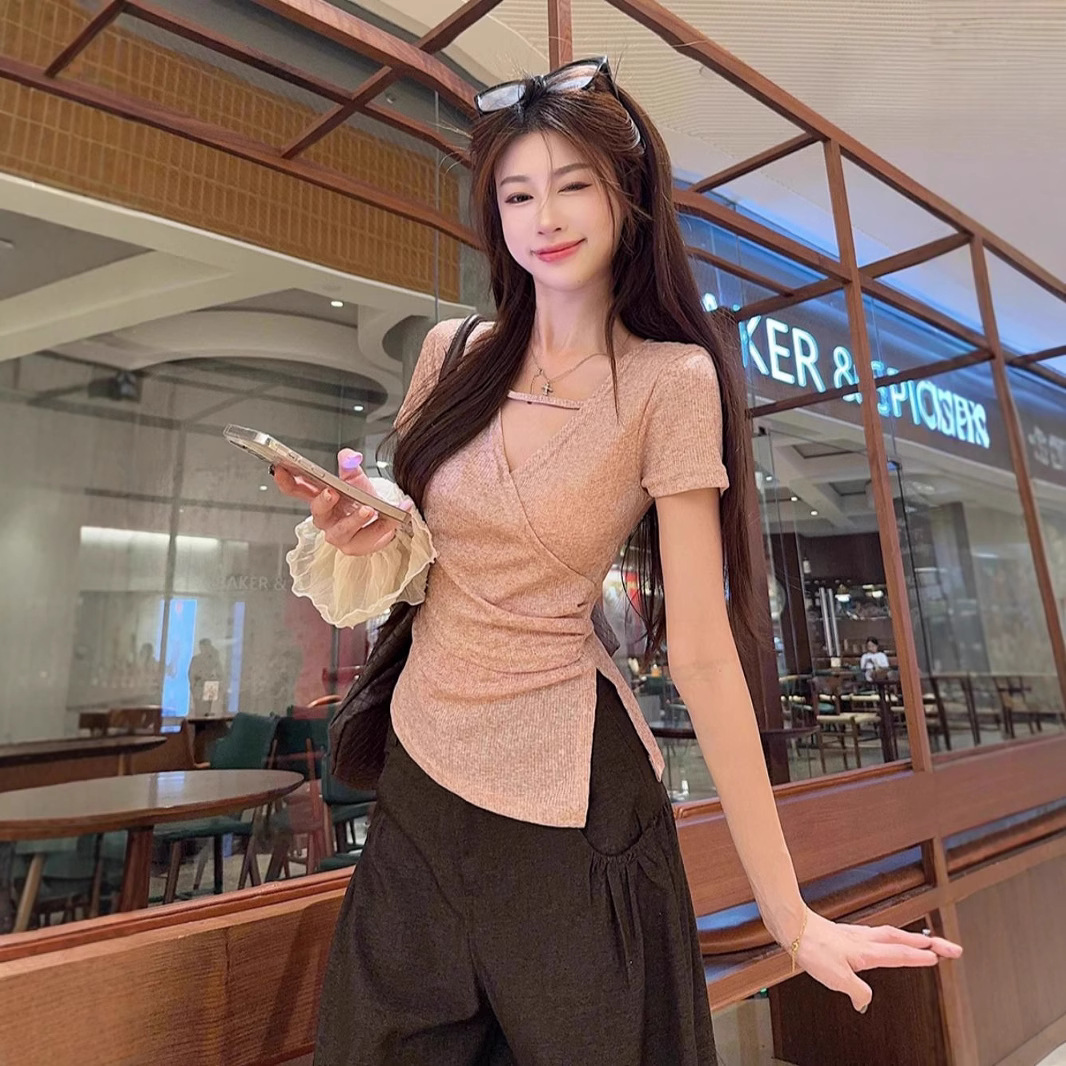 デザインピュアディザイア不規則スリット半袖Tシャツ2025年夏新作クロスVネックプリーツスリムフィットトップ