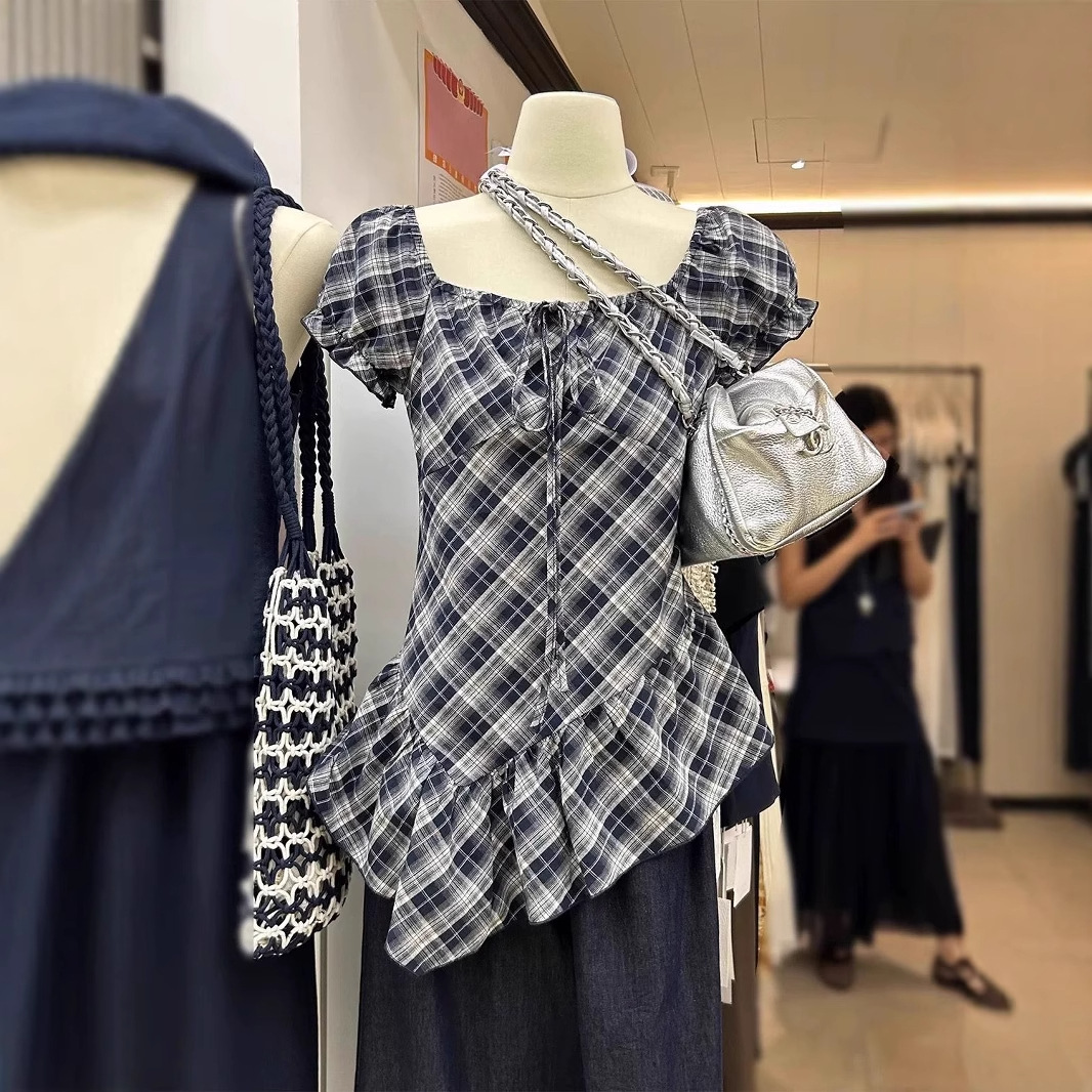 レトロチェック柄スクエアカラーパフスリーブ不規則なトップ女性のための 2025 夏フレンチスタイルの新しいスリムフィット Tシャツ