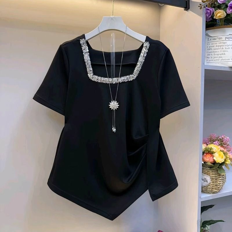 ファッショナブルなヨーロッパの太った女の子のスリットTシャツ夏の新しい大きいサイズの頑丈なスクエアネックプリーツ不規則なウエストと年齢を減らす