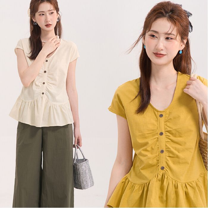 お腹カバー痩身無地綿麻万能トップスレディース夏新作半袖デザインフリルプリーツTシャツ