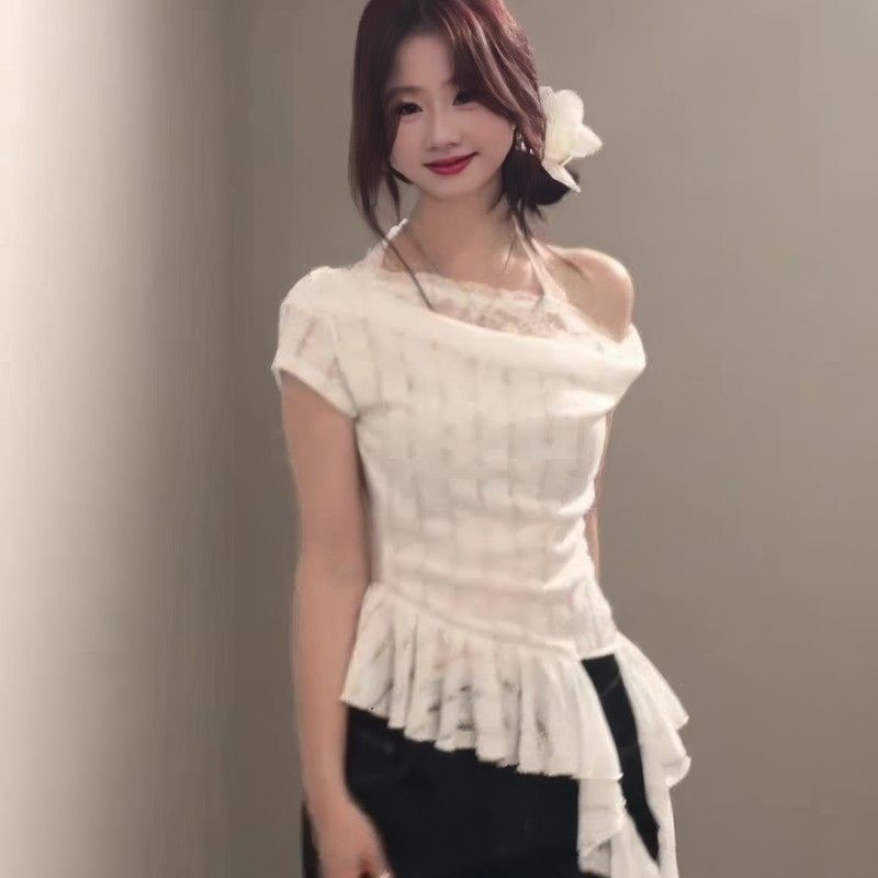 Sweet Hot Girl レースステッチホルターネックフェイクツーピース Tシャツ女性用夏の斜め襟純粋な欲望リボンデザイン不規則