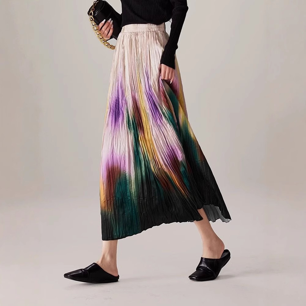 高級絞り染めスリットスカート夏フレンチスタイル新スタイルファッショナブルでエレガントなプリーツミドル丈Aラインスカートハイウエスト