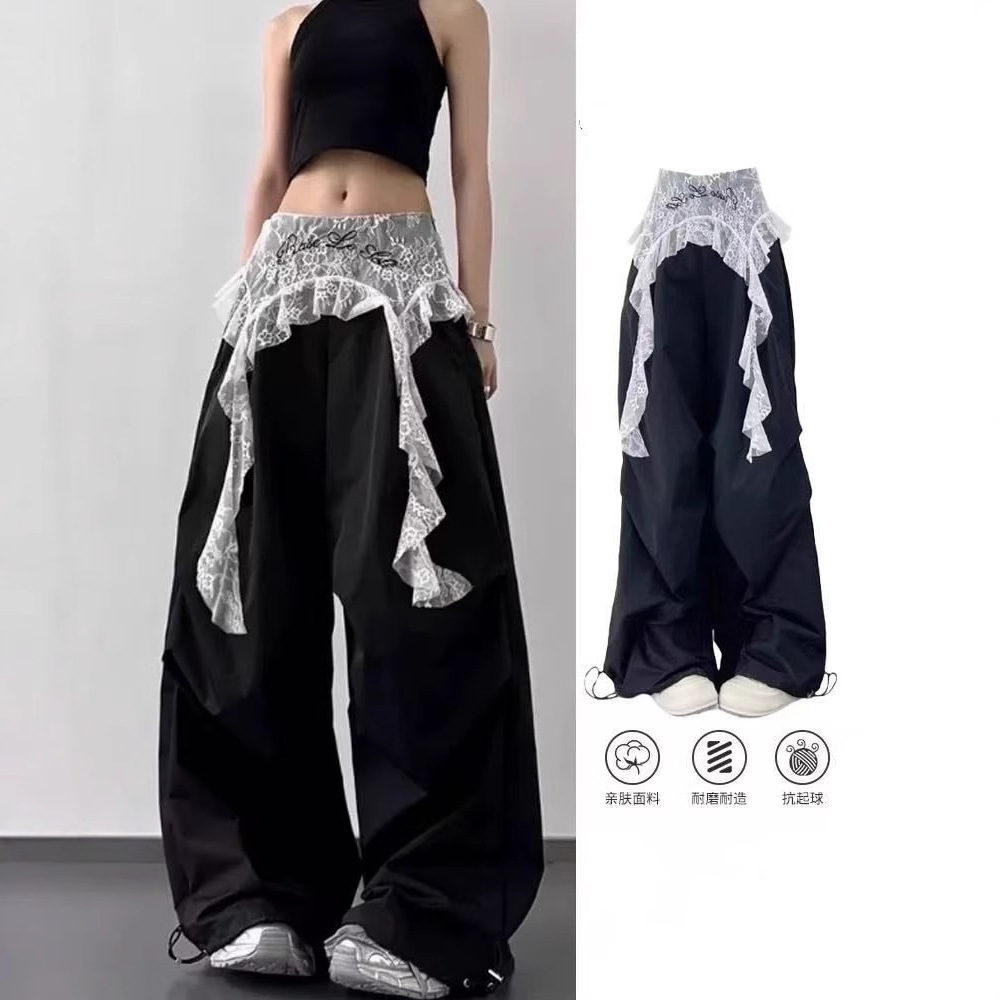 春夏デザイン偽ツーピースレーススプライシングパンツ女性用2025新しいトレンディな多用途ルーズカジュアルパンツ