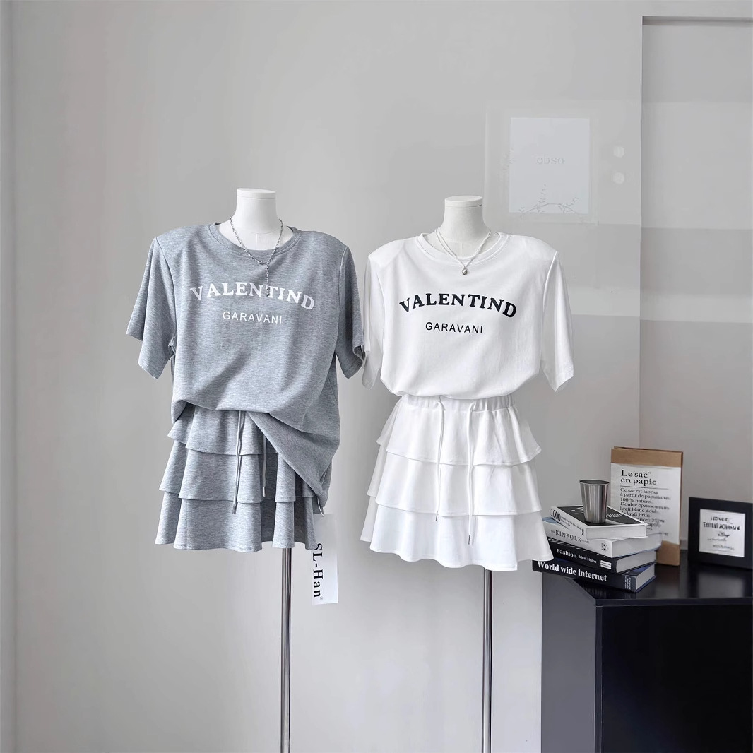 女性用ティーショートスカートスーツ、甘い新しいラウンドネック半袖トップ+ハイウエストスリムケーキスカート韓国風2点セット