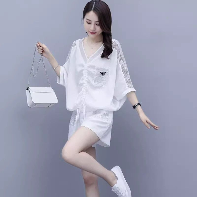 女性のためのカジュアルスポーツショーツスーツ 2025 新しい V ネック巾着プリーツトップ大きいサイズ西洋スタイルスポーツスーツトレンディ