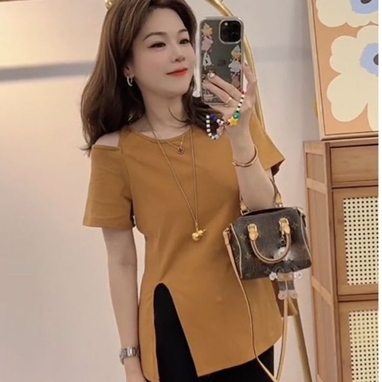 ソリッドカラーオフショルダースプリット大きいサイズ半袖Tシャツ2025夏韓国風スリムラウンドネックファッショナブルな女性用ニットセーター