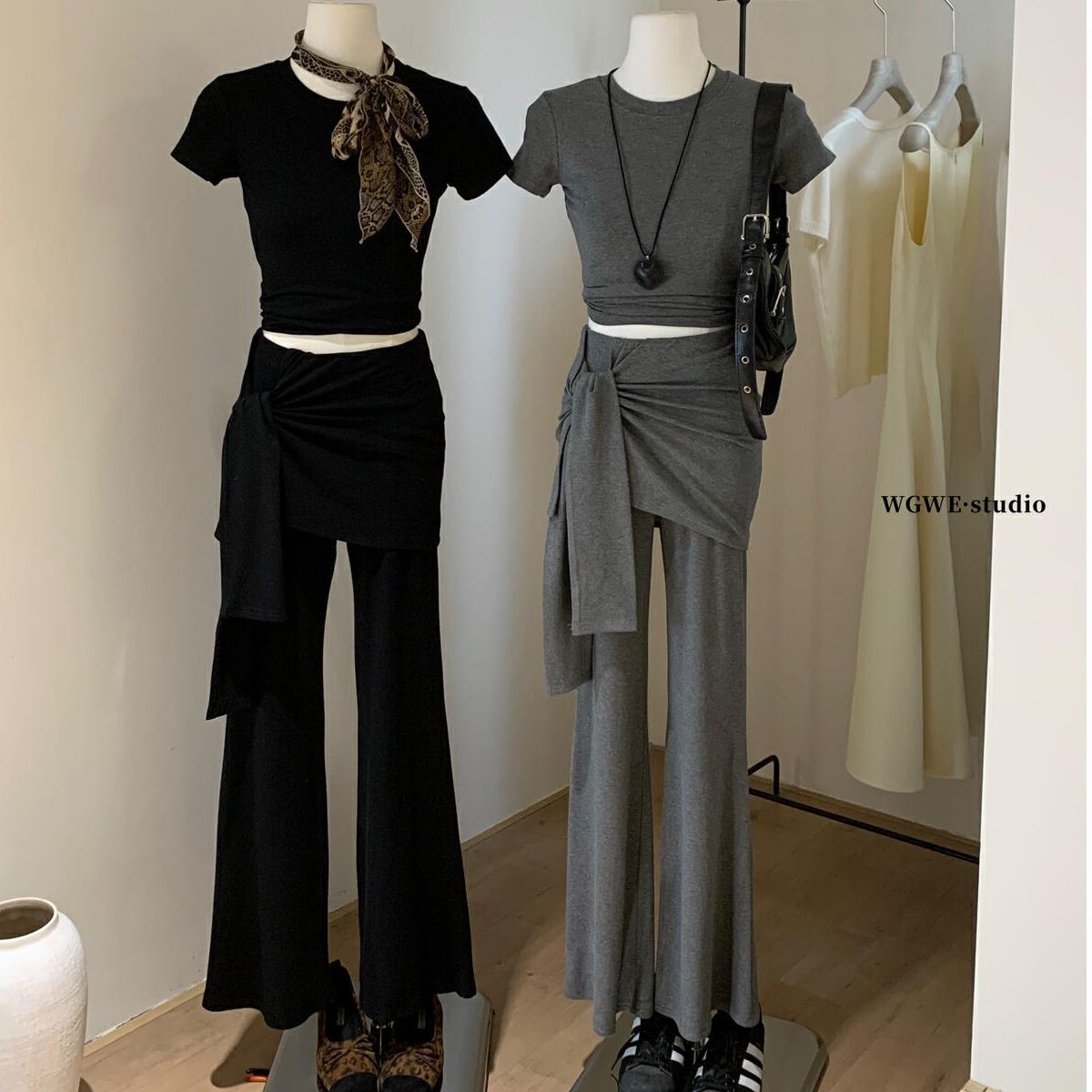 夏の韓国ファッション多用途右肩半袖トップス+デザインフェイクツーピースマイクロフレアパンツ2セット女性用