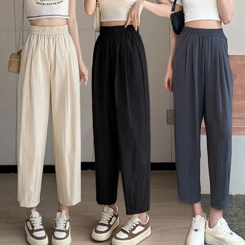 夏のアイスシルクバックル大きいサイズレギンス韓国スタイルの新しい弾性ウエストポケット大きいサイズの綿とリネンのカジュアルハーレムパンツ女性用