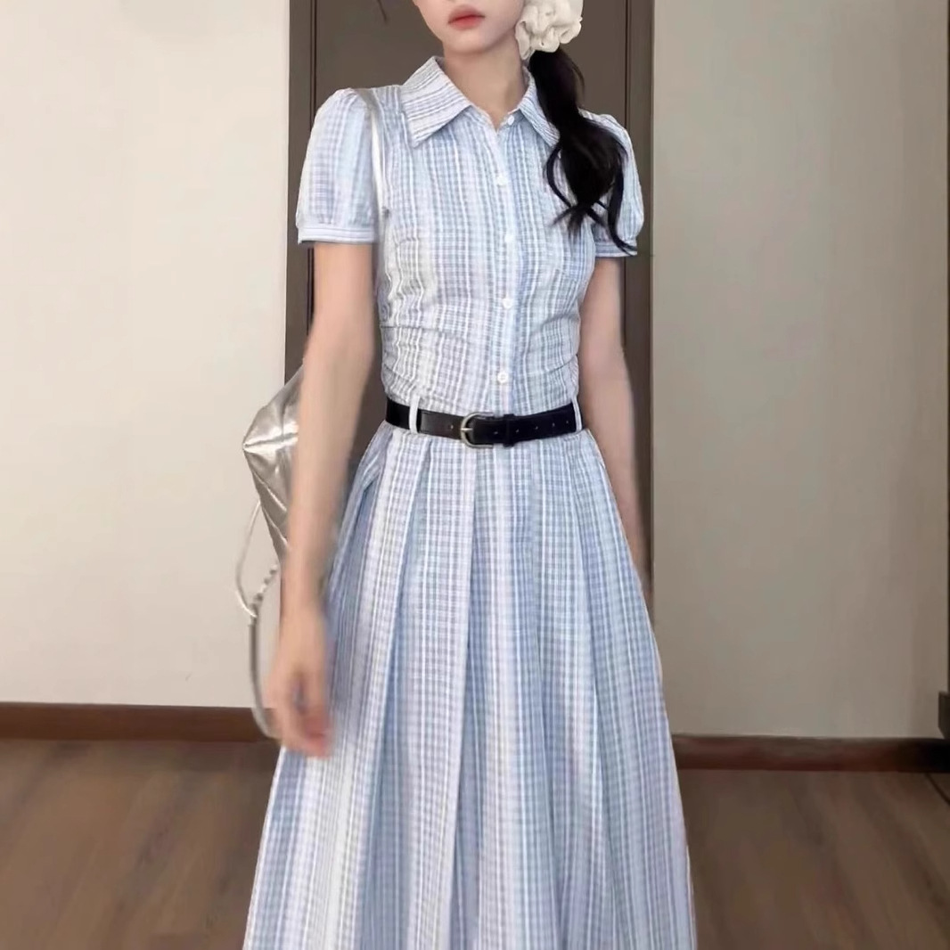 ベルト付きフレンチスタイルシャツドレス女性用2025夏ハイエンド超見栄えの良いウエストを絞る半袖ロングスカートトレンディ