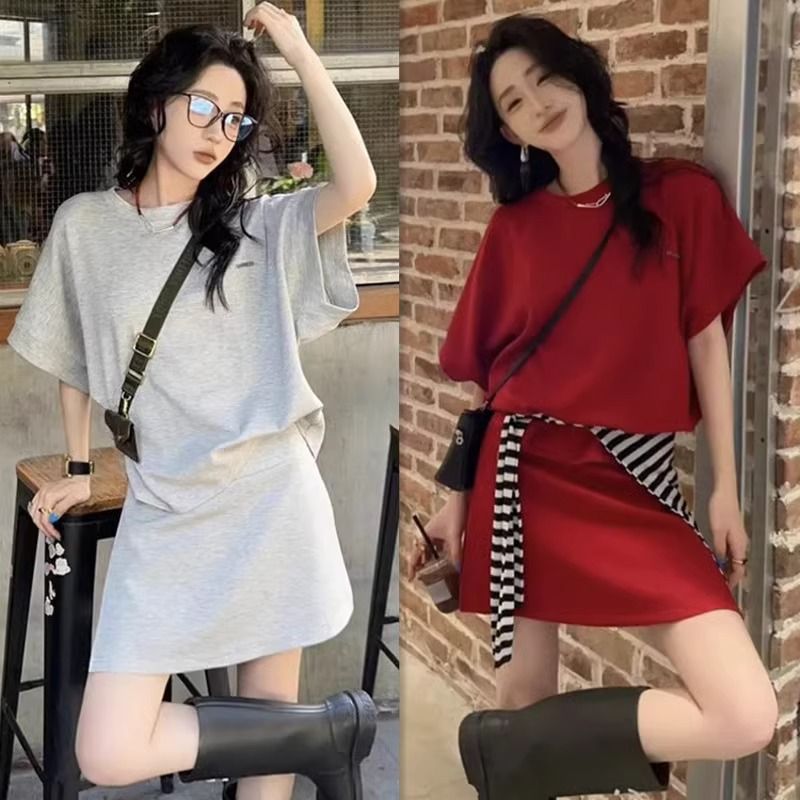 デザインニッチ、優しくて快適、レイジースタイルの半袖Tシャツトップス、おしゃれなスカート+ストライプショールの女性用3点セット