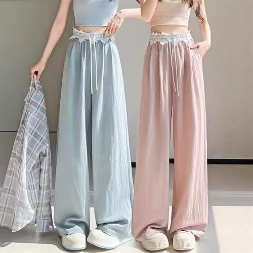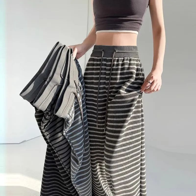 女性用ストライプカジュアルパンツ2025韓国新作ハイウエストスリム万能パンツ春夏コントラストカラーステッチワイドレッグパンツ