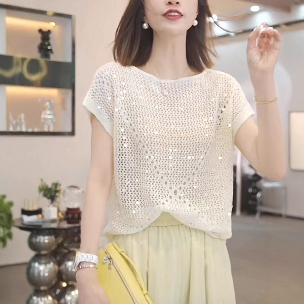 気質ヘビーデューティスパンコール中空アイスシルクセーター2025夏の新しいスタイル絶妙で見栄えの良い年齢を減らす女性用半袖トップ