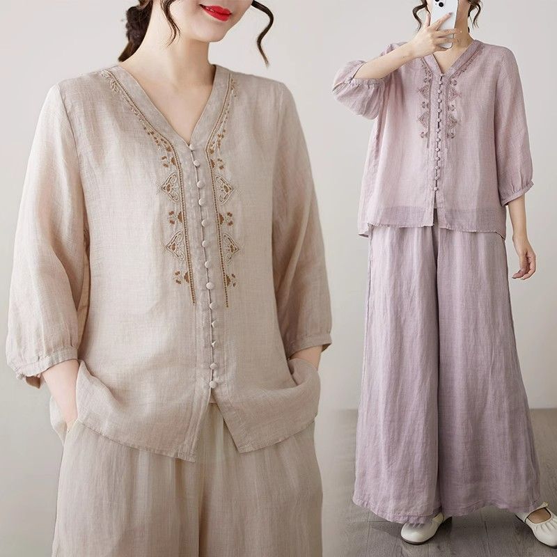 中国風刺繍カジュアル綿とリネンパンツスーツ女性のための 2025 新しい文学的な V ネックルーズ七分袖トップワイドレッグパンツ