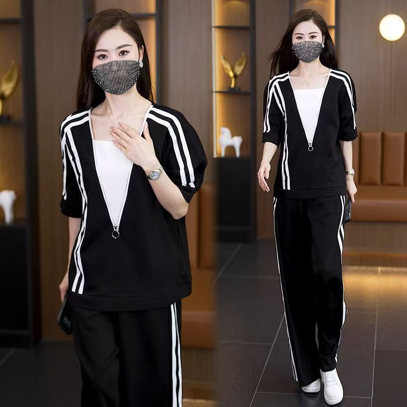 スポーツウェアの小柄な二点セットの女性夏カジュアル半袖上着のボトムシャツのゆったりとしたワイドレギンスのショートパンツセット