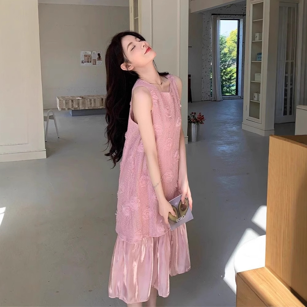 ドーパミンピンクの花甘くて優しいスタイルのノースリーブベストドレス女性の夏の休暇スタイル偽ツーピースピンクのロングスカート