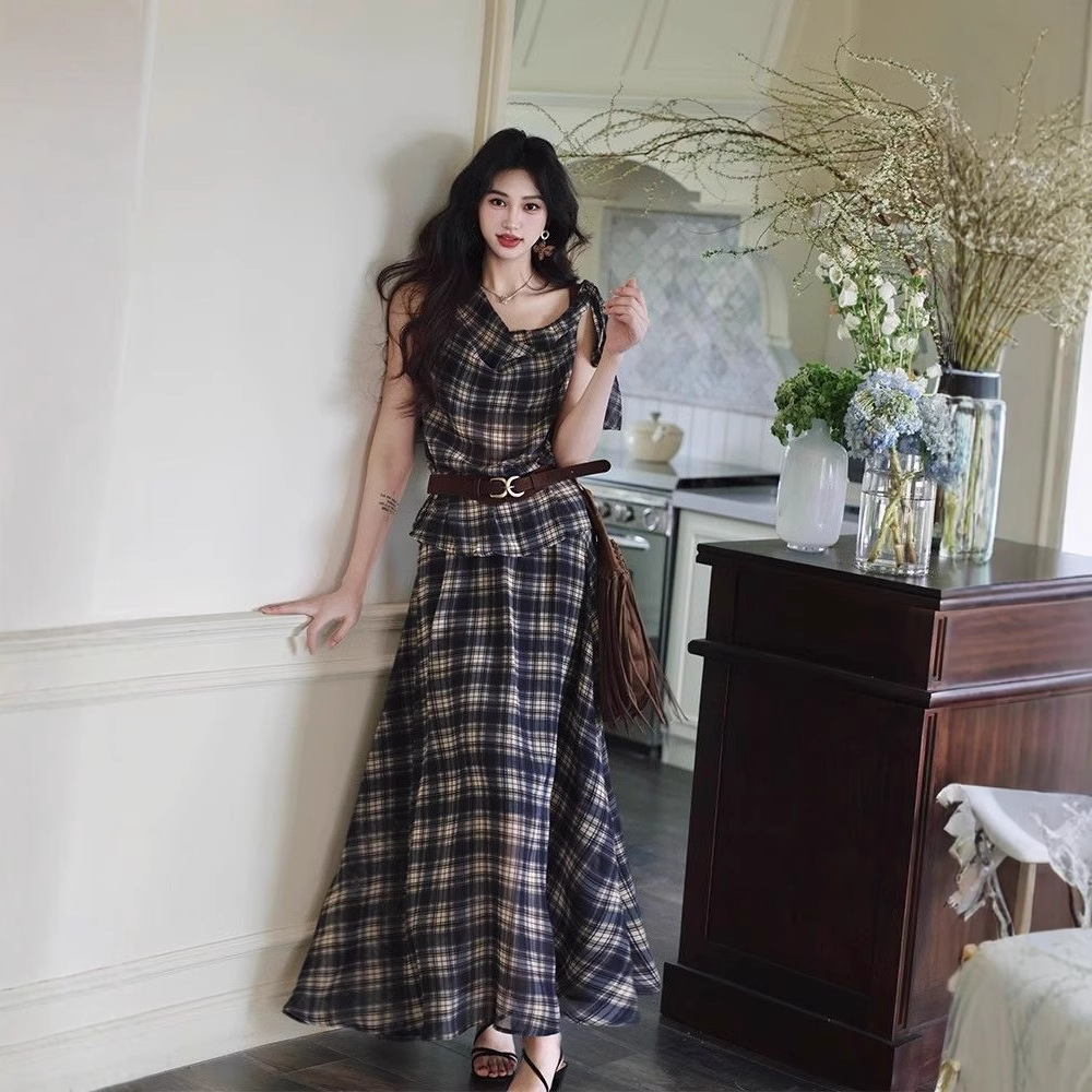フレンチレトロスイングカラーノースリーブベストトップスーツハイウエストロングスカート気質ツーピース夏の新しいスタイル