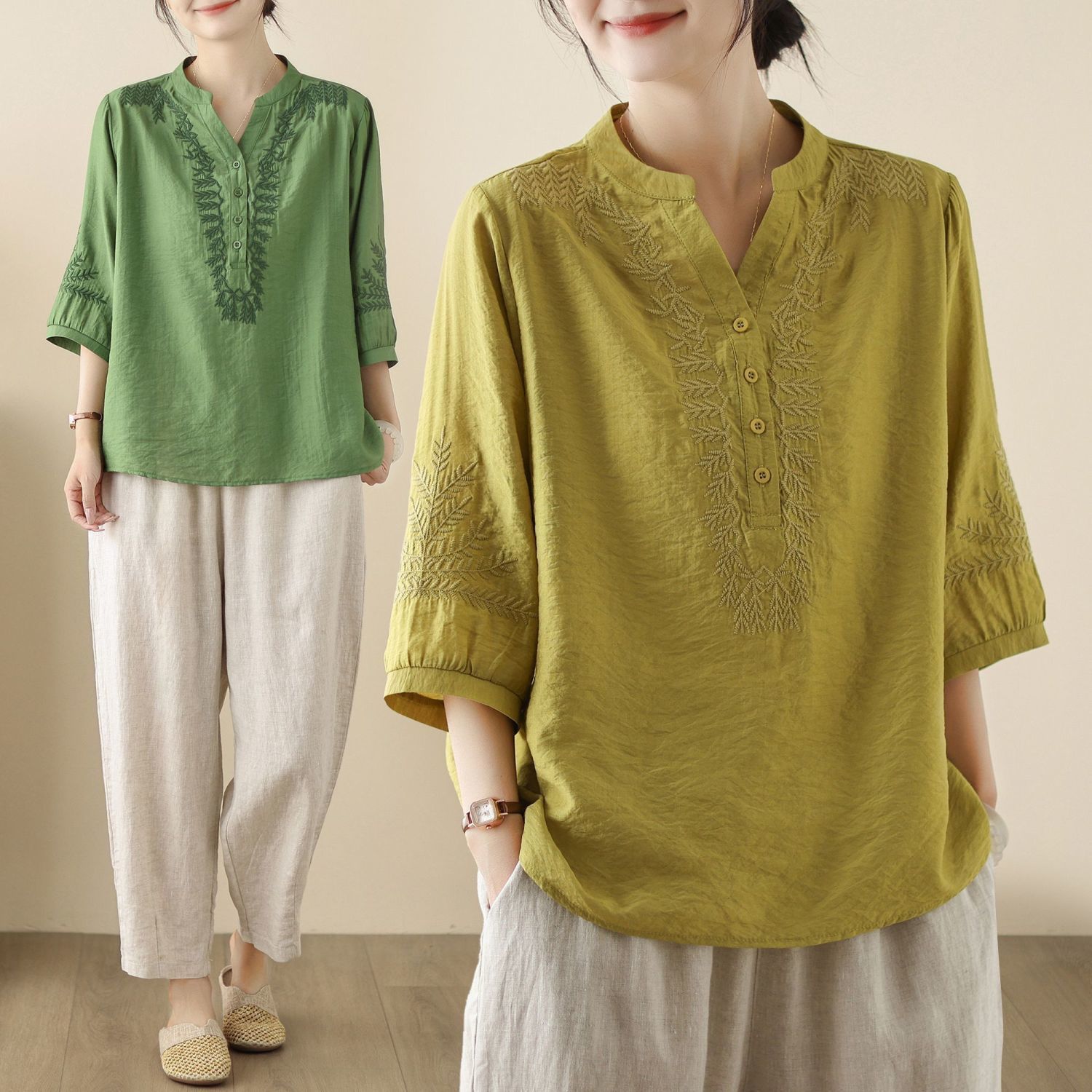 文学レトロ刺繍アイスシルクコットンとリネン Tシャツ夏 2025 新しい国民風大きいサイズルーズトップ多用途女性