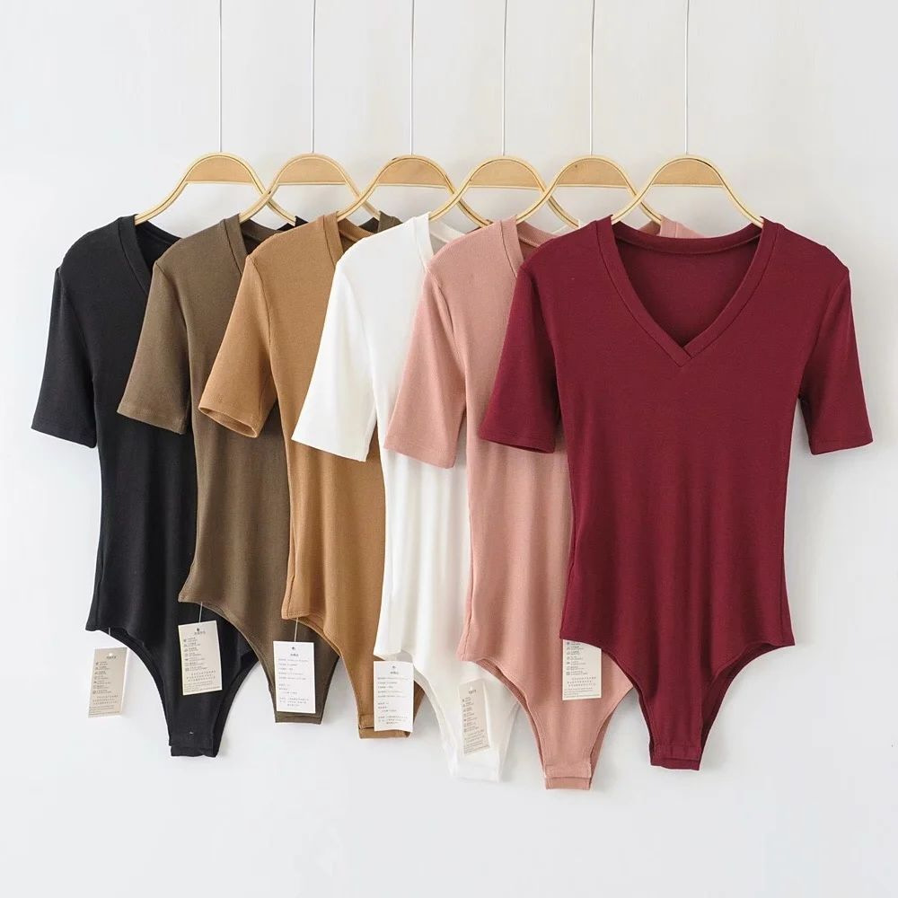 Vネック純色半袖ワンピース女性2024夏欧米風弾力ガードルtシャツ純欲ギャル百合上着
