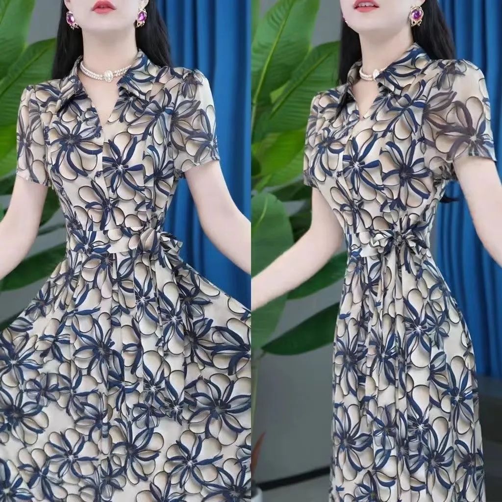 西洋風レトロママウェアウエスト半袖ドレスラペルファッショナブル通勤デイリーサマースタイル万能スカート